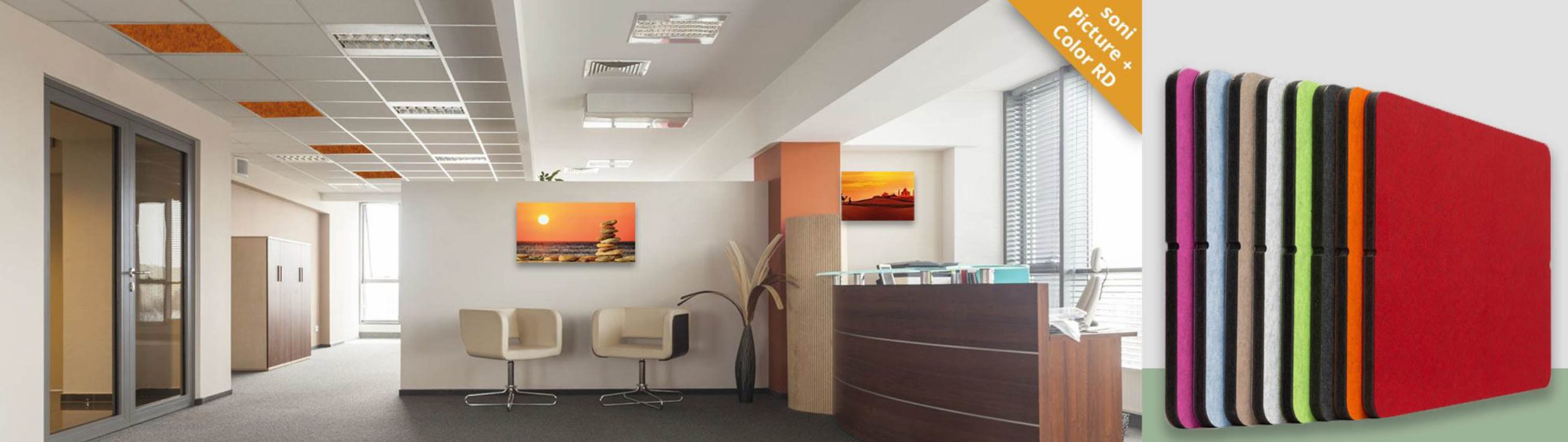 “soni Room dividers” kambarių pertvaros ir stalinės pertvaros yra ypatingos rūšies garso slopintuvai, nes jos ne tik užtikrina veiksmingą garso izoliavimą, bet ir suteikia daugiau privatumo jūsų darbuotojams. “soni ROOM DIVIDER” ir “soni DESK PARTITION” pagrindą sudaro minkšta neaustinė plokštė, iš abiejų pusių sutvirtinta sutankintos poliesterio neaustinės medžiagos sluoksniu. Matomi paviršiai yra padengti dekoratyviniu aukštos kokybės ir purvui atspariu veltinio sluoksniu. Suapvalinti viršutiniai kampai sukuria modernią, patrauklią išvaizdą.
